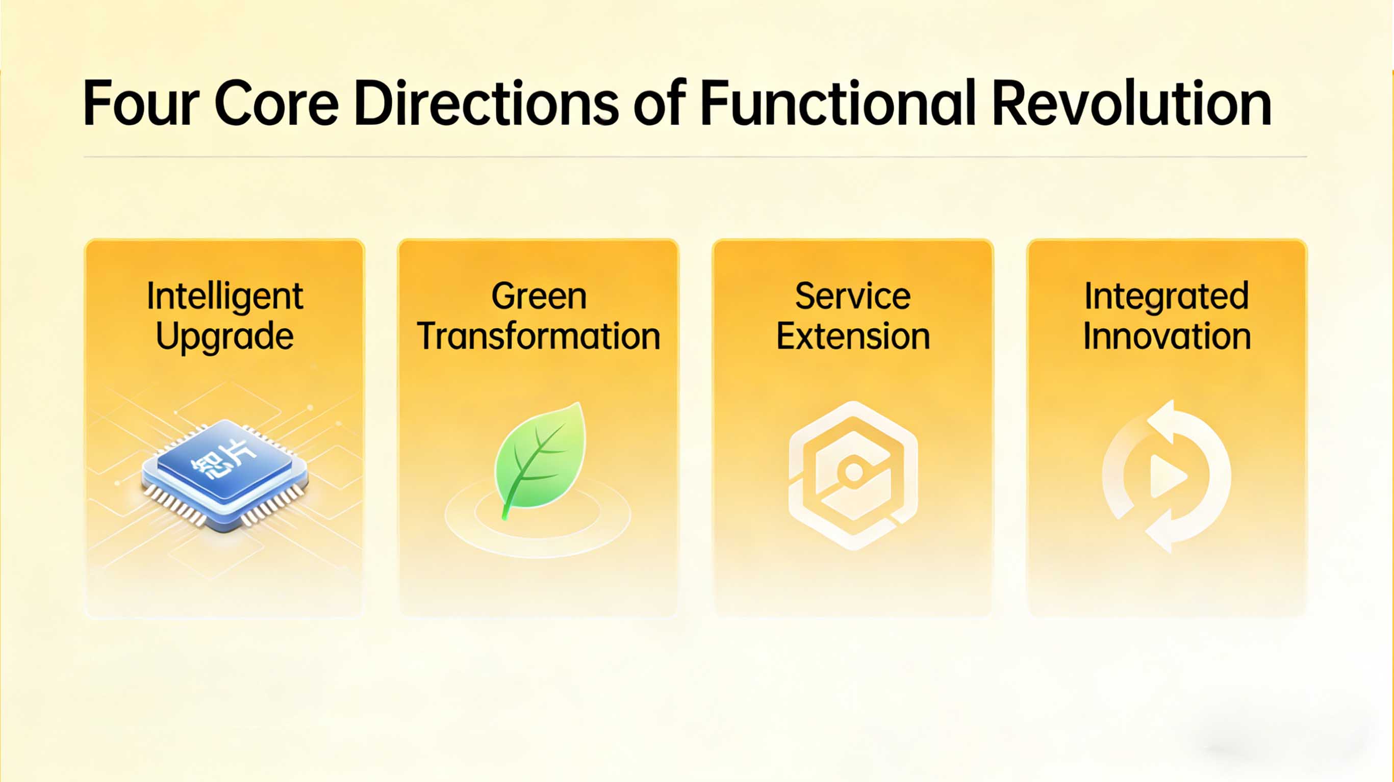 A: The four core directions are basic function upgrade (eco-friendliness & safety), scenario function customization (adapting to different scenarios), smart function integration (temperature control, sensing, etc.) and composite function integration (multiple core functions in one product).